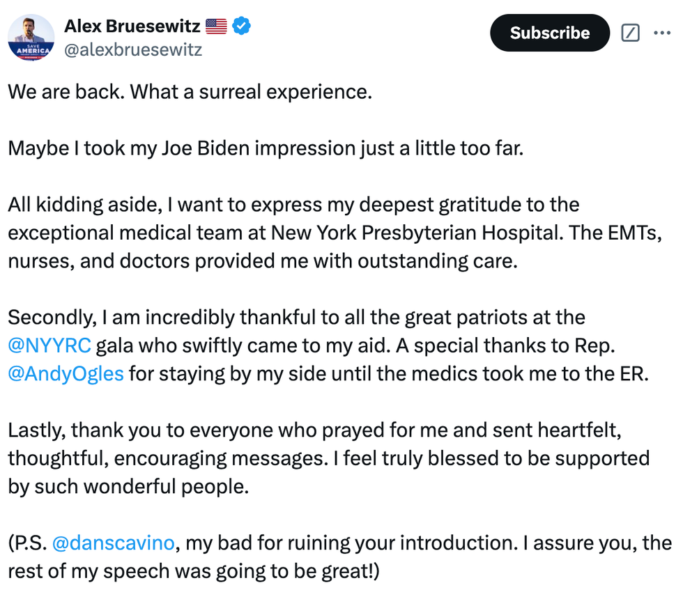 In his post, Bruesewitz chalked his fainting up to a moment of emulating the president gone wrong. Biden has of course been repeatedly characterized by both side of the aisle, as well as the media, as doddering and unsteady.