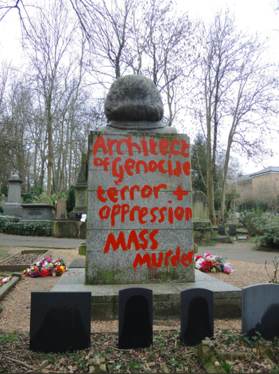 Highgate Cemetery shared photos of the defaced memorial, and said the following about the vandalism: