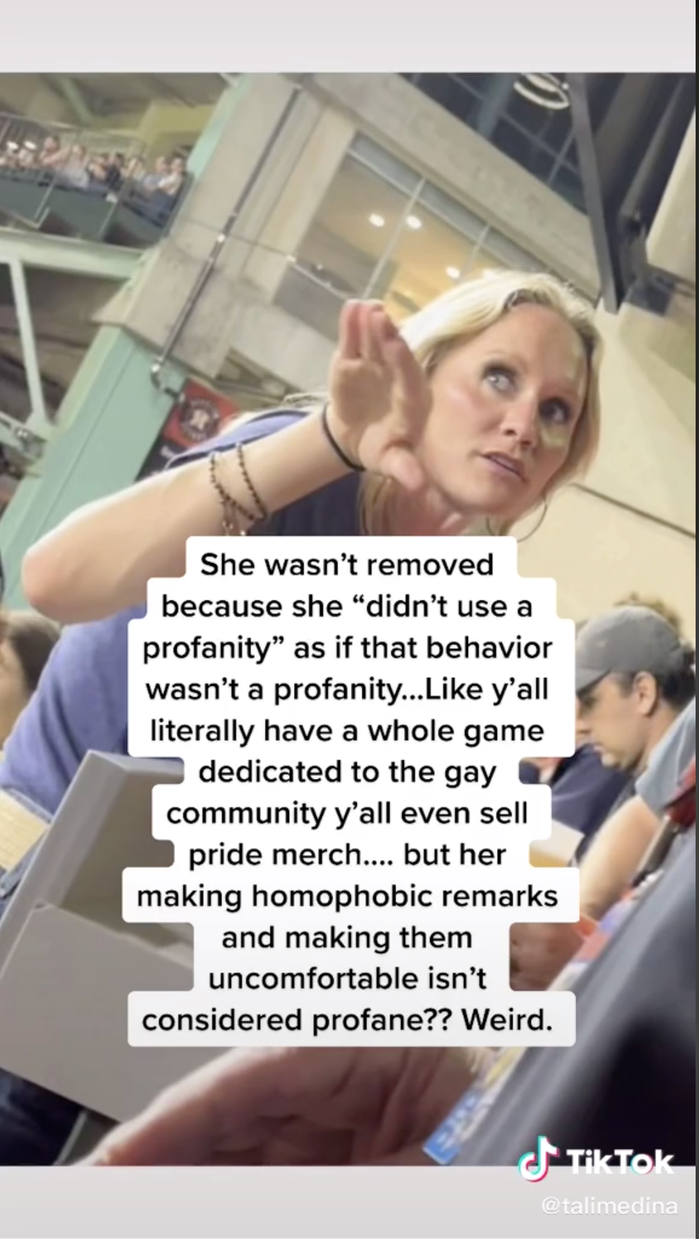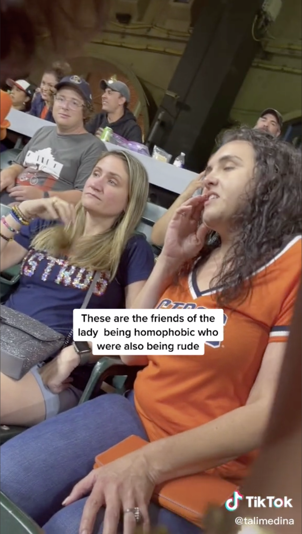 TikToker @talimedina filmed herself at the game and told viewers she was about to "pull the f'k up" after her LGBTQ friends claimed the people sitting behind them made homophobic remarks and took pictures and making fun of them.
