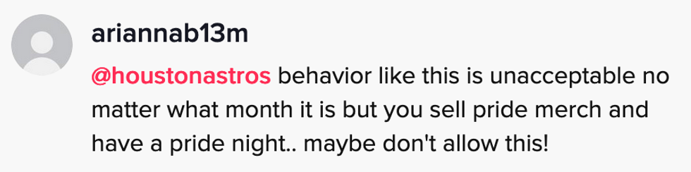 "She wasn't removed because she 'didn't use a profanity' as if that behavior wasn't a profanity…Like y'all literally have a whole game dedicated to the gay community y'all even sell Pride merch…. but her making homophobic remarks and making them uncomfortable isn't considered profane?? Weird."