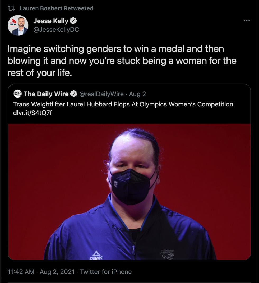 Boebert retweeted a tweet written by Jesse Kelly, the host of "The Jesse Kelly Show" on KPRC 950 in Houston and a former congressional candidate in Arizona. Kelly, writing about New Zealand Olympic weightlifter Laurel Hubbard, wrote: