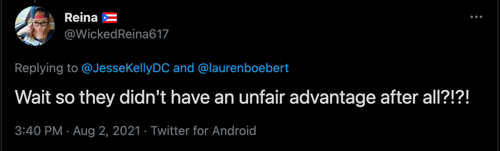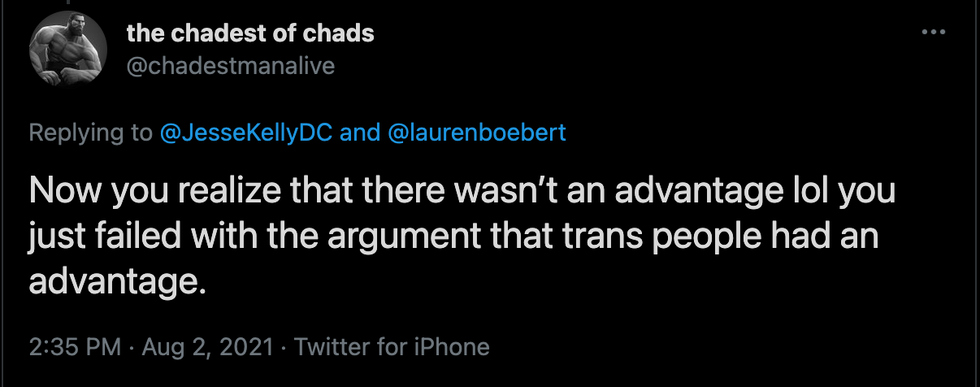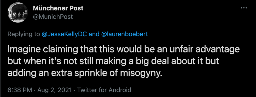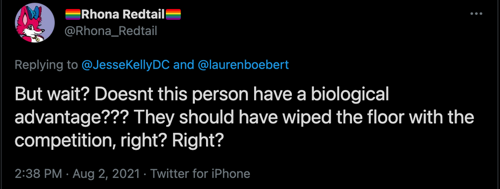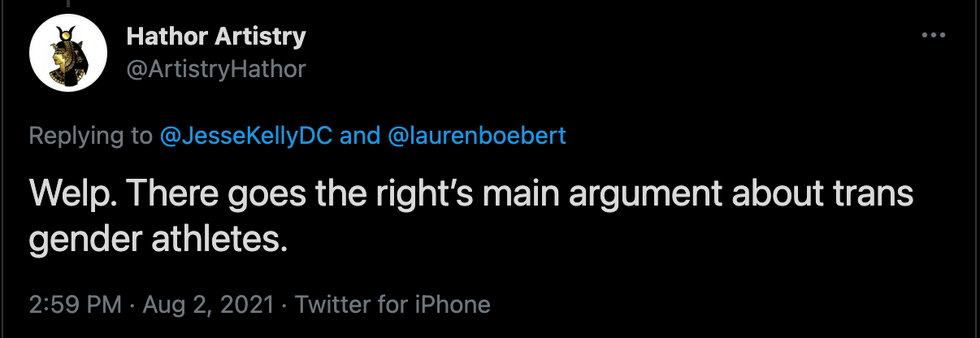 Boebert was largely criticized for amplifying Kelly's transphobic message. The fact that Hubbard did not win a medal at her first and only event was also used to shut down implications that she had a biological advantage in the competition.
