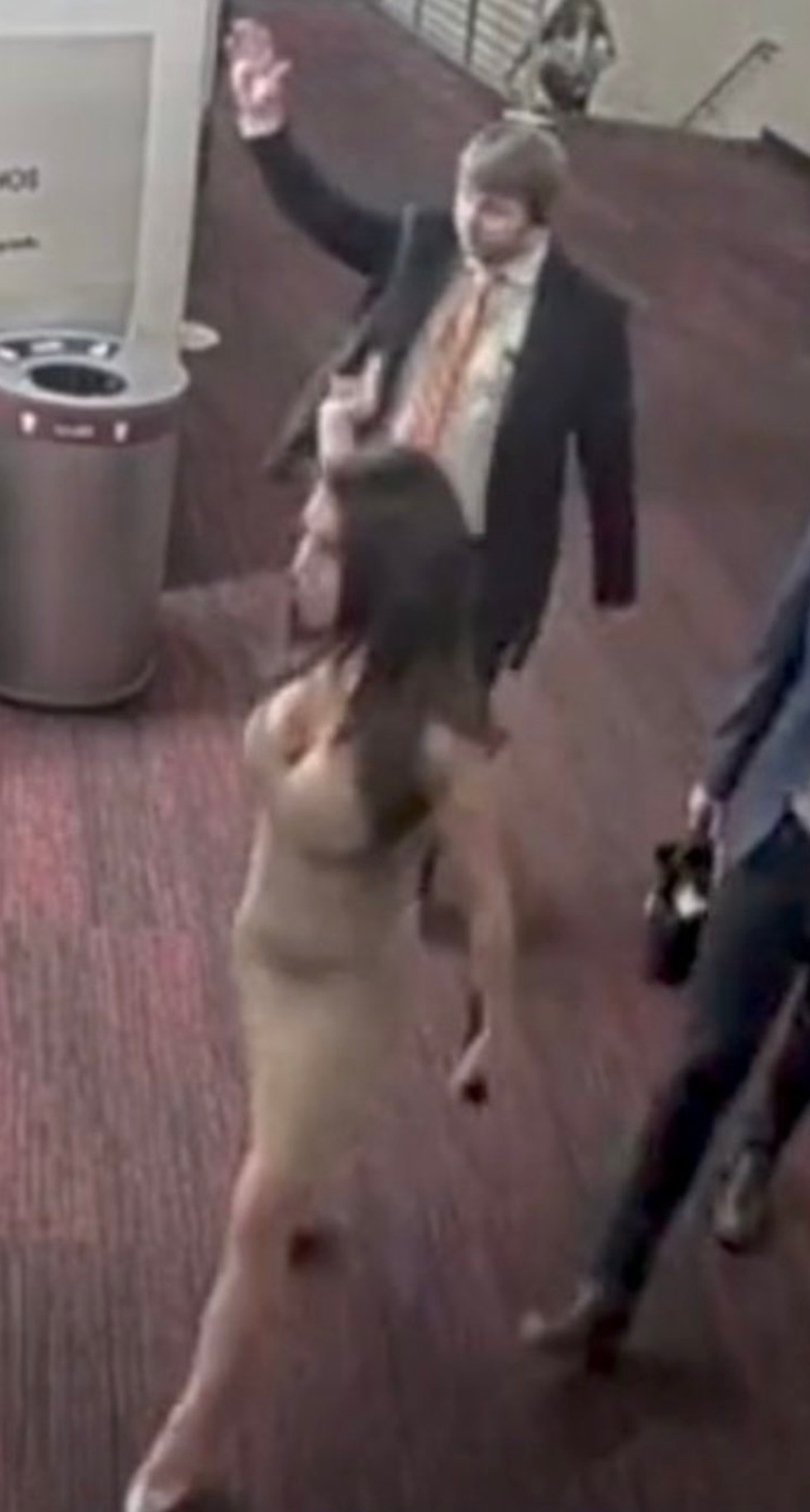 Surveillance footage of her and her date being approached by ushers at their seats and being escorted out of the auditorium through the lobby was shared on X (formerly Twitter) in a series of clips.