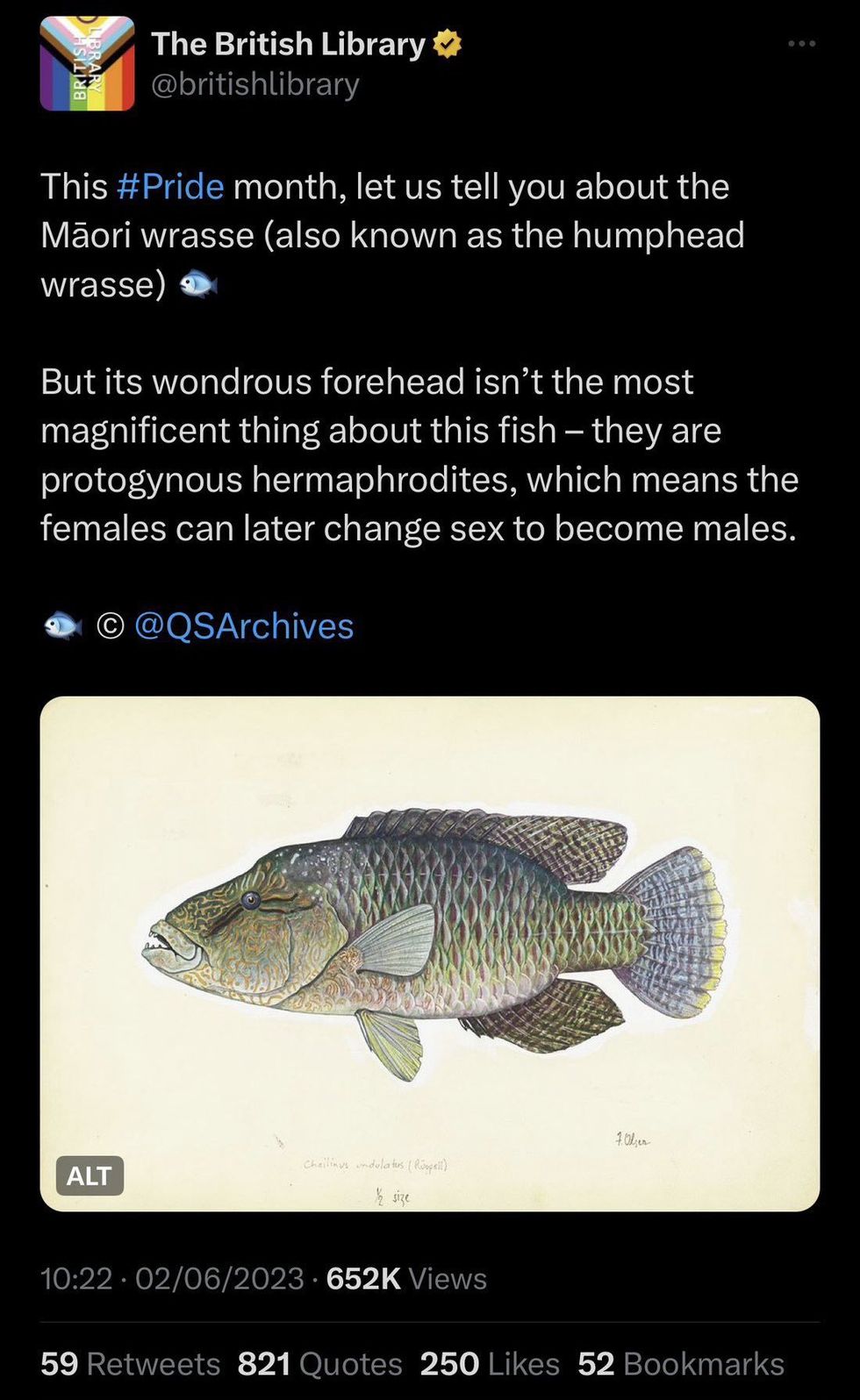 The British Library celebrated LGBTQ+ Pride Month by tweeting about the Māori wrasse, a fish that can change its sex from female to male.
