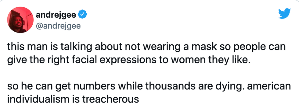 "But all of that energy gets blocked when your mask is on. Energy is important, and we are all conductors of f*cking good energy."