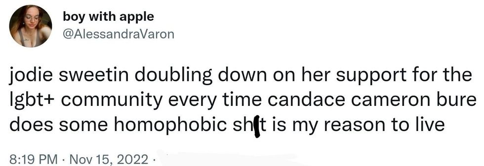 \u201cRemember when Jojo Siwa said Candace Cameron Bure was rude & Candance had a meltdown over it? And now Candace is, again, being rude (homophobic). There's no mean girl like a white evangelical mean girl. And they have the nerve to gatekeep the definition of "love" and "kindness".\u201d— \ud835\udd38. \ud835\udd44\ud835\udd52\ud835\udd63\ud835\udd5a\ud835\udd56 \ud83c\udf42 (@\ud835\udd38. \ud835\udd44\ud835\udd52\ud835\udd63\ud835\udd5a\ud835\udd56 \ud83c\udf42) 1668628634