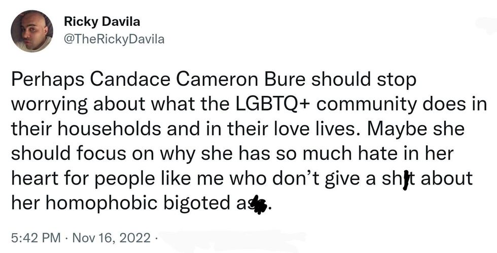 \u201cI just have to comment. Candace Cameron Bure left the Hallmark channel because they started to feature gay people, and she started her own network for the sole purpose of excluding gay people. There really is no hate like Christian love.\u201d— Nathan Alexander (@Nathan Alexander) 1668632481