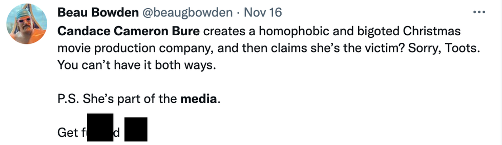 \u201cFINALLY A NETWORK FOR STORIES WITH STRAIGHT LEADS!!! \n\nCandace Cameron Bure you're that girl, we knew you were. Enjoy your straight, white echo chamber, because something tells me people outside of your cult (or under the age of 80) won't be "prioritizing" watching your movies.\u201d— Kit Williamson (@Kit Williamson) 1668468191