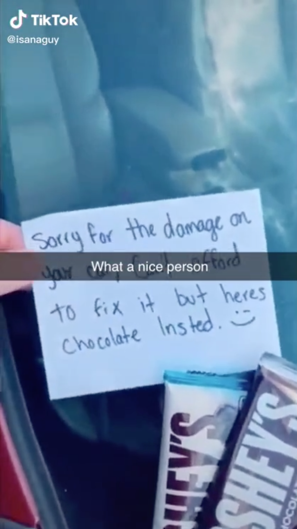 "Sorry for the damage on your car," said the note, adding, "Can't afford to fix it, but here's chocolate instead."