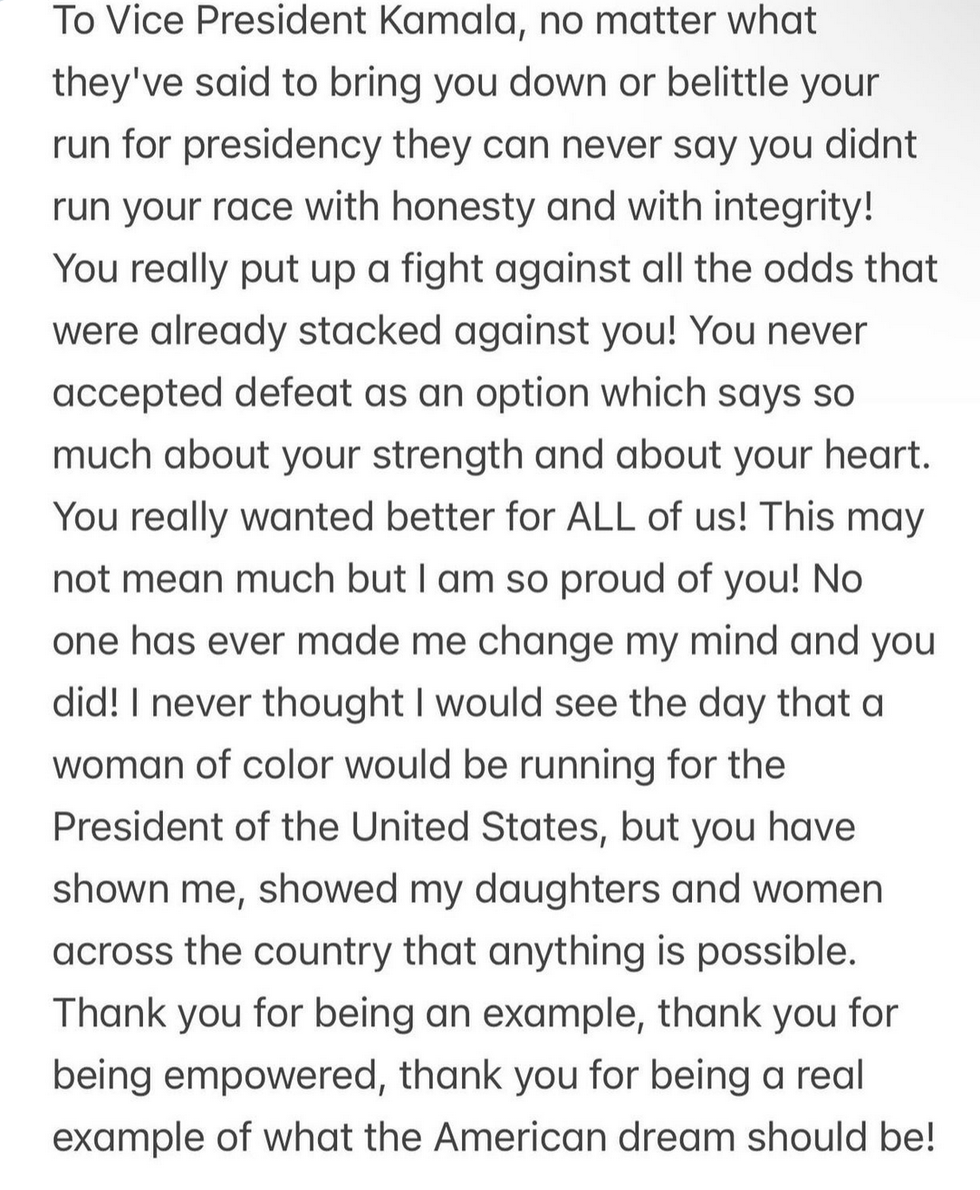 "Before Kamala joined the race, we knew how this country is set up and what was probably going to happen but it was so inspiring how she fought and changed so many minds, including mine."