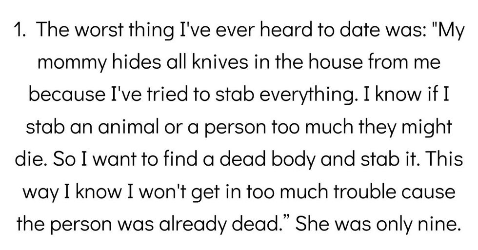 "I can't be trusted with knives. My mommy hides all knives in the house from me because I've tried to stab everything and everyone. I know if I stab an animal or a person too much they might die. This would mean I'd go to jail and I don't think I could make it in jail. So I want to find a dead body and stab it over and over again. This way I know I won't get in too much trouble cause the person was already dead."