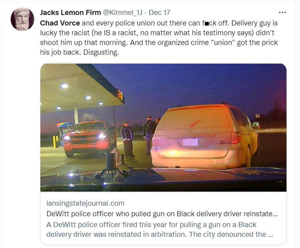 No surprise, racist Dewitt cop, Chad Vorce. Remember that name, he\u2019s been emboldened and will be a racist repeat offender. Hopefully next time he does not kill someone.https://twitter.com/TheRoot/status/1471925933401534464\u00a0\u2026— ModeratelyGrumpy (@ModeratelyGrumpy) 1639886564