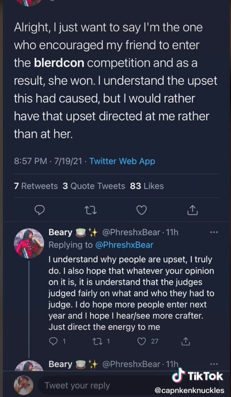 But TikToker @capnkenknuckles maintained she believed the contest winner should not have participated in the first place.