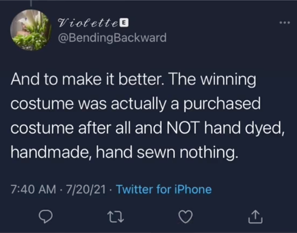People became more upset when Twitter user @BendingBackward revealed the winning woman's costume was "actually a purchased costume after all and NOT hand-dyed, handmade, hand-sewn, nothing."