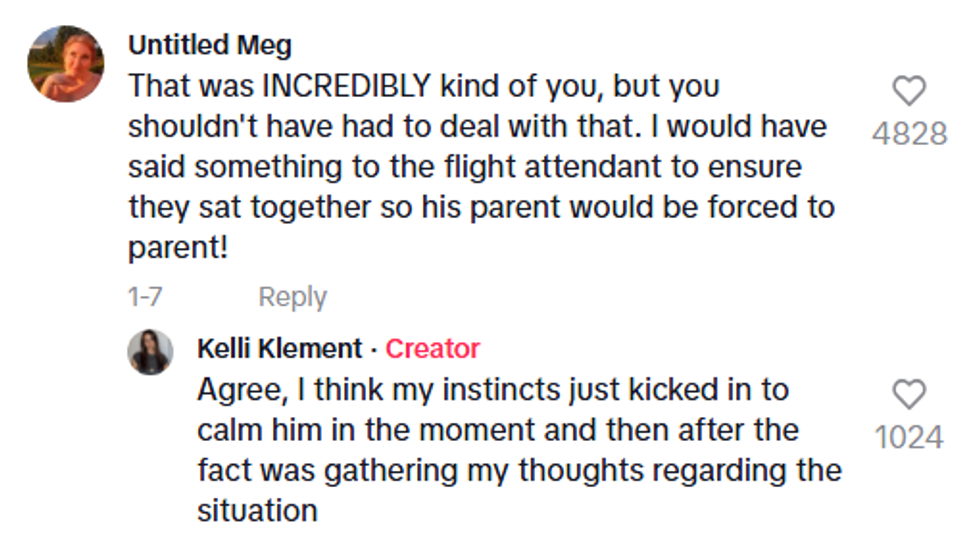 Klement called suddenly being thrust into an unexpected and unpaid childcare role of a stranger's child "an interesting situation," but over the course of the flight, she had to attend to the child, including making sure that he didn't have any allergies to the in-flight snacks, cleaning his hands when he got chocolate on them, and otherwise keeping him entertained and calm while he was understandably nervous on the flight without his dad.