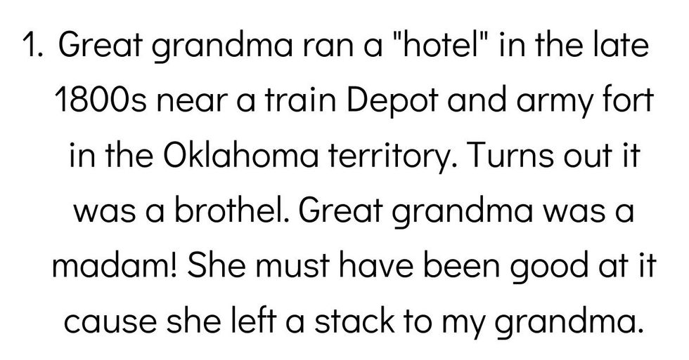 Great grandma ran a "hotel" in the late 1800s near a train Depot and army fort in the Oklahoma territory. Turns out it was a brothel. Great grandma was a madam! She must have been good at it cause she left a stack to my grandma.
