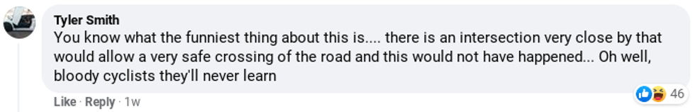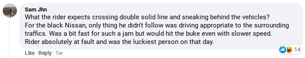 Most of the comments were quick to blame the cyclist for riding through the traffic.