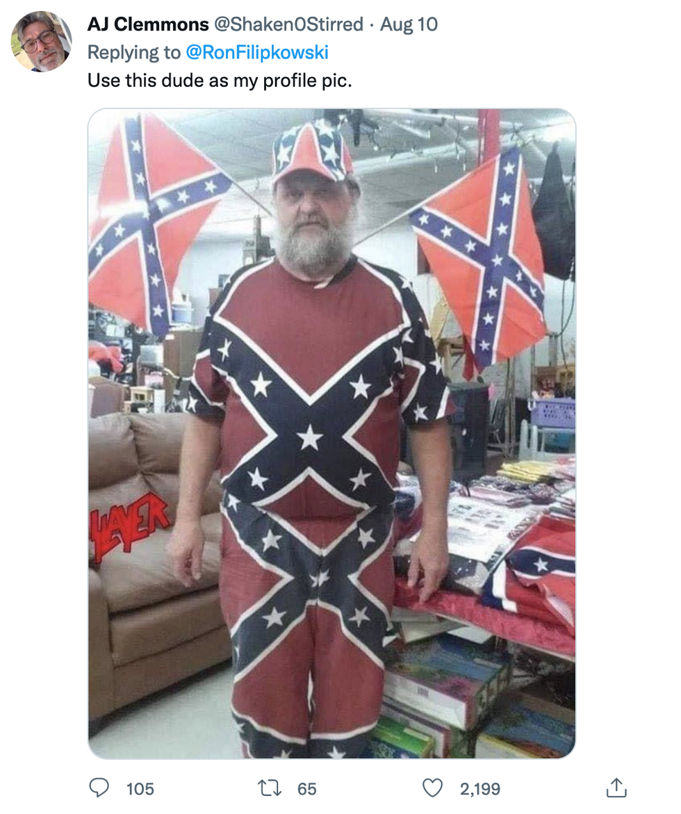 \u201c@RonFilipkowski Can just imagine the match questions. Do you like long walks around burning crosses? Going for drinks and harrassing drag queens? Enjoy evenings at home watching Fox news? Travelling to romantic Trump rallies? Antiquing for Confederate flags? Etc. Etc.\u201d— Ron Filipkowski \ud83c\uddfa\ud83c\udde6 (@Ron Filipkowski \ud83c\uddfa\ud83c\udde6) 1660169389
