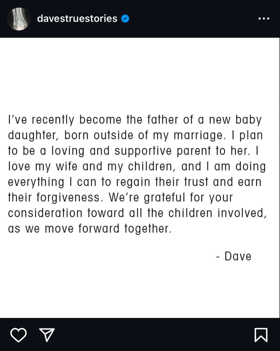 "I’ve recently become the father of a new baby daughter, born outside of my marriage. I plan to be a loving and supportive parent to her."