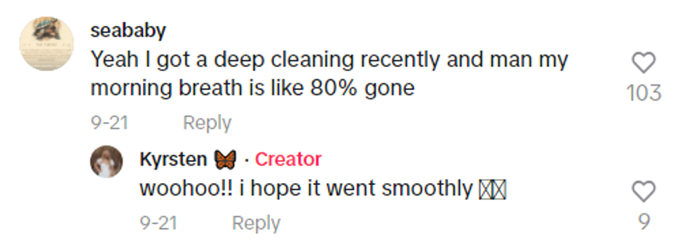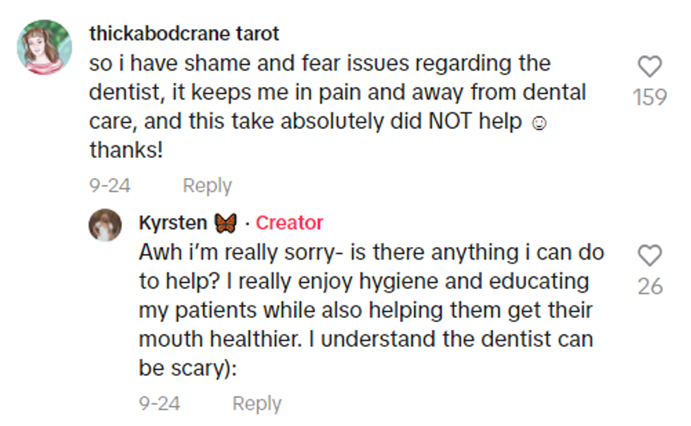 TikToker and dental hygienist Kyrsten (@kyrsten.sprouse on the platform) has created a safe space with a lengthy series of videos on how to properly brush and floss, how to increase comfortability while visiting the dentist, and which signs of diagnoses to watch out for at home.