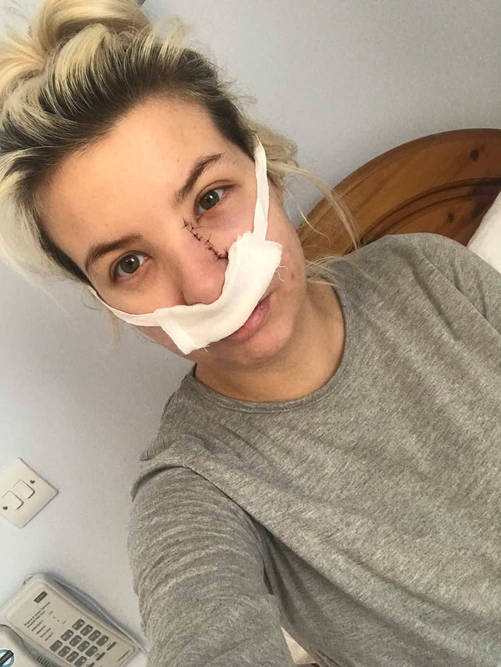 When tests revealed that the spot had turned septic, she was blue-lighted to Brighton's larger Royal Sussex County Hospital, where she was given painkillers and antibiotics and a biopsy of the tissue on her nose was sent away for analysis.