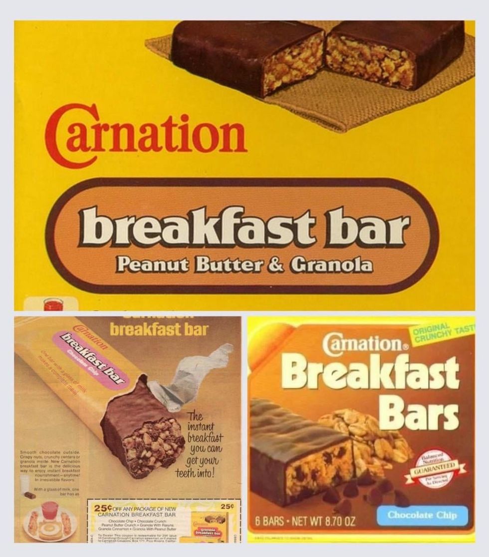 "Carnation breakfast bars were created by Carnation in 1976. The bars were made out of granola and covered in chocolate and were available in peanut butter and chocolate chip. Carnation sold the product until 1997."