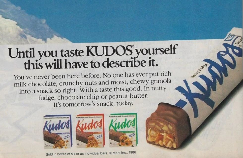 * Kudos was a milk chocolate granola cereal bar produced by candy giant launched in 1986 with three varieties: nutty fudge, chocolate chip, and peanut butter. Future flavors included bits of Mars candy including Snickers, M&Ms, and Dove chocolate. The original intention was to offer a healthier candy bar alternative, not a granola bar. After recipe changes, sales dropped and Mars discontinued Kudos in 2017.