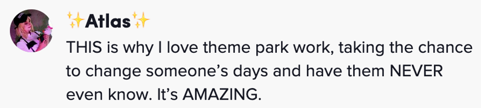 Employees at a Disney park–who are known as "cast members" in Disney parlance–go out of their way to ensure all the guests at the park have a magical day.