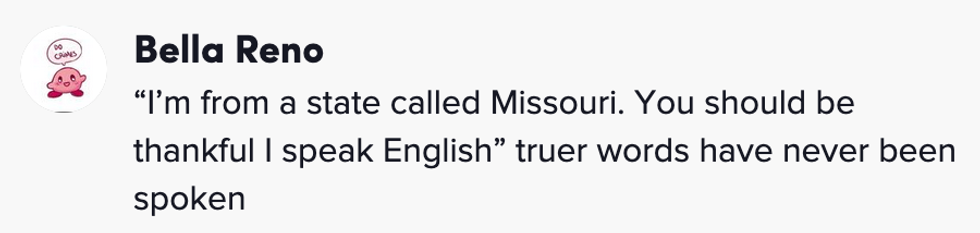 He joked that because his nametag indicated he was from the state of Missouri the woman should be thankful he can speak English.
