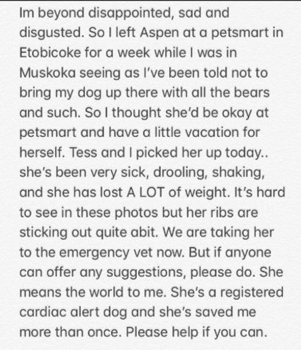 Dixon vacationed in Muskola and says he took Aspen to PetSmart after being told it wasn't good to bring dogs to the vacation spot because of the bears. After returning from his trip, Dixon picked up Aspen at PetSmart and immediately noticed she didn't look well. He says that she was shaking, drooling, underweight, and sitting in a pool of vomit. Dixon told CBC: