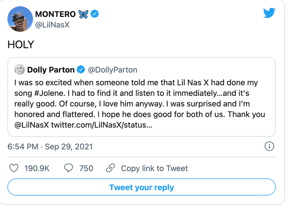 When Lil Nas X, the first musician to publicly come out as gay while having a number one record on the charts, became aware of Parton's affectionate words, he returned to Twitter to express his amazement, which he summed up in two words- "Holy Sh*t."