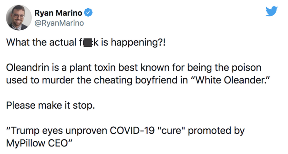 Given the progression in toxicity from #hydroxychloroquine to #oleandrin, I assume #cyanide is the next step. Just give me a heads up and make sure your insurance is active. #thisntsafe