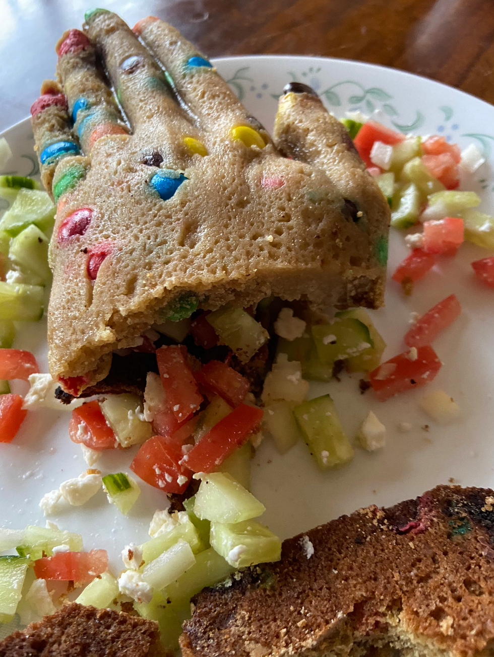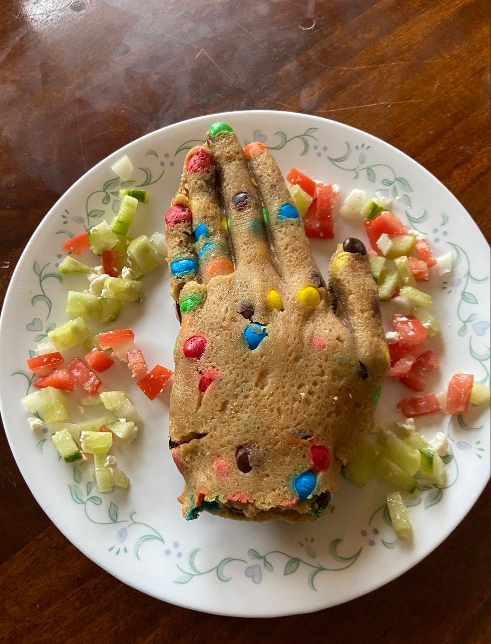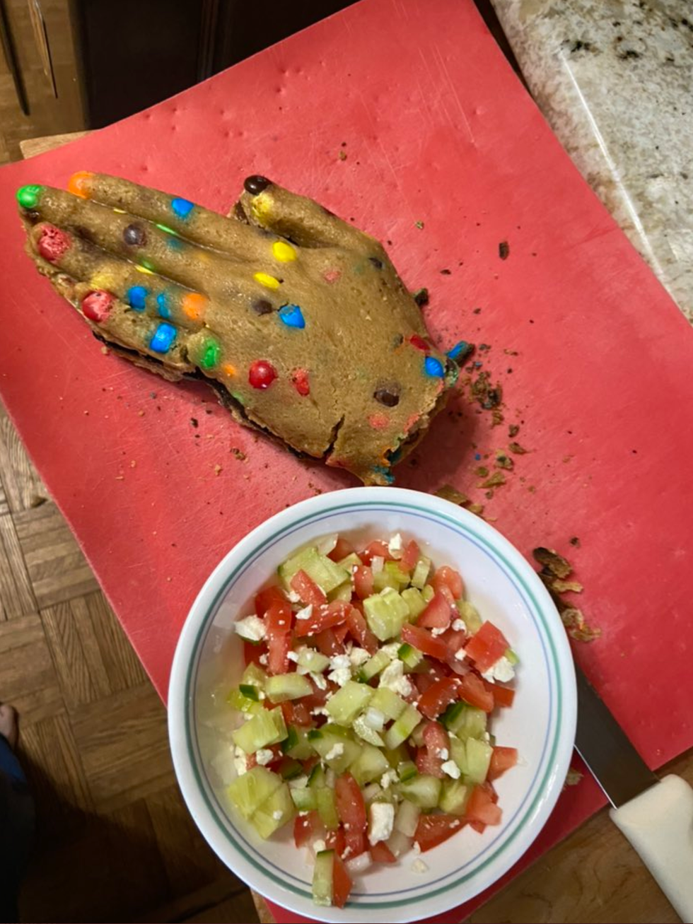 The dish took the shape of a hand "made of M&M cookie" and stuffed with, of all things, a Greek salad.