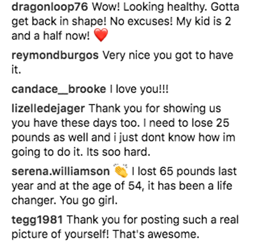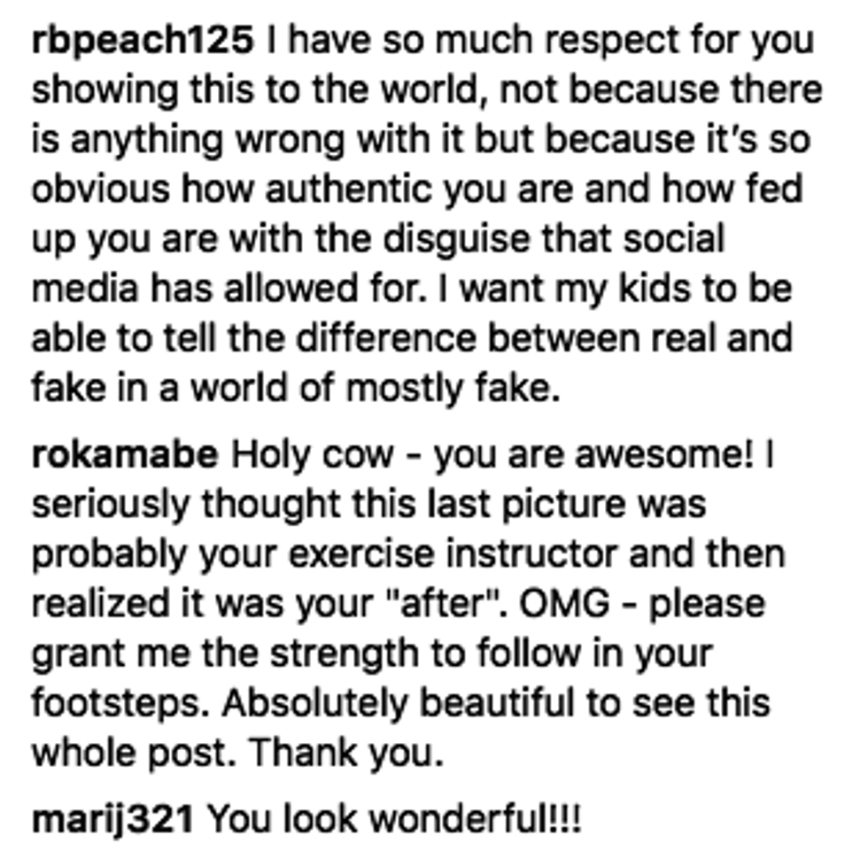 "When I look at Instagram, I am made to think I should be at my best self. But most days, I lack consistency due to real life," she wrote, before giving a shoutout to a professional (@marniealton) who helped her lose 25 pounds.