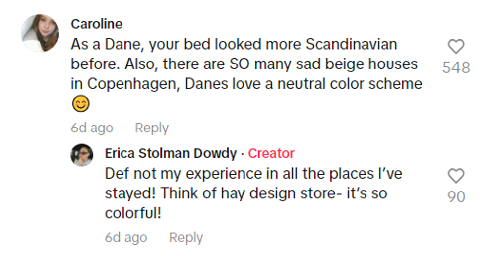 Stolman Dowdy starts off by pointing out that Scandinavian homes to not believe in an all-white aesthetic and instead include bright pops of color. The TikToker decided to go with a soft pink and yellow theme in the room and specifically used linens, which she pointed out as "the most comfortable" and the only fabric that Scandinavian homes use.