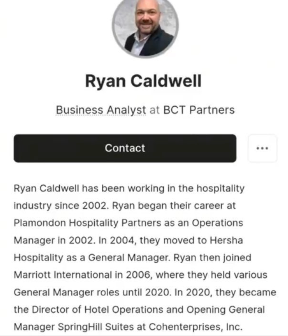 The haranguer was identified as Ryan Caldwell, a business analyst at BCT Partners, a New Jersey-based management consulting firm who has worked in the hospitality industry since 2002 with managerial roles at Plamondon Hospitality Partners, Hersha Hospitality, Marriott International, and Cohenterprises.
