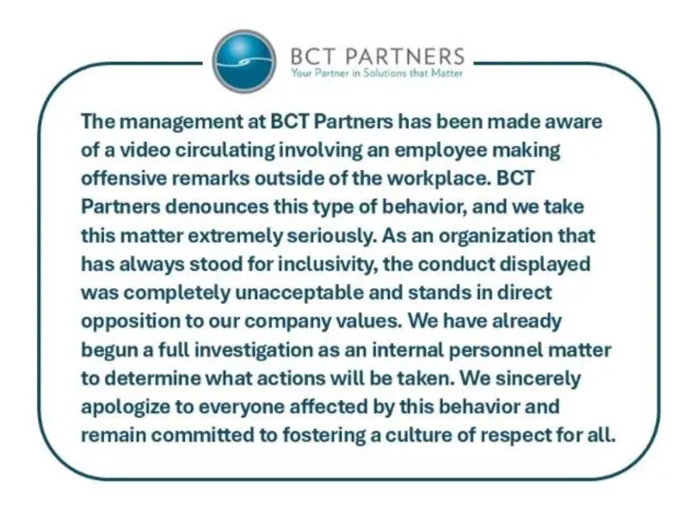 BCT Partners issued a statement after having seen the viral video of their unhinged employee.