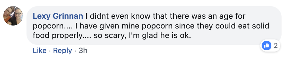 "I wanted to share our experience because as I've shared the story so many people were shocked and unaware of the bad effect popcorn can have on a toddler," she wrote on February 24.