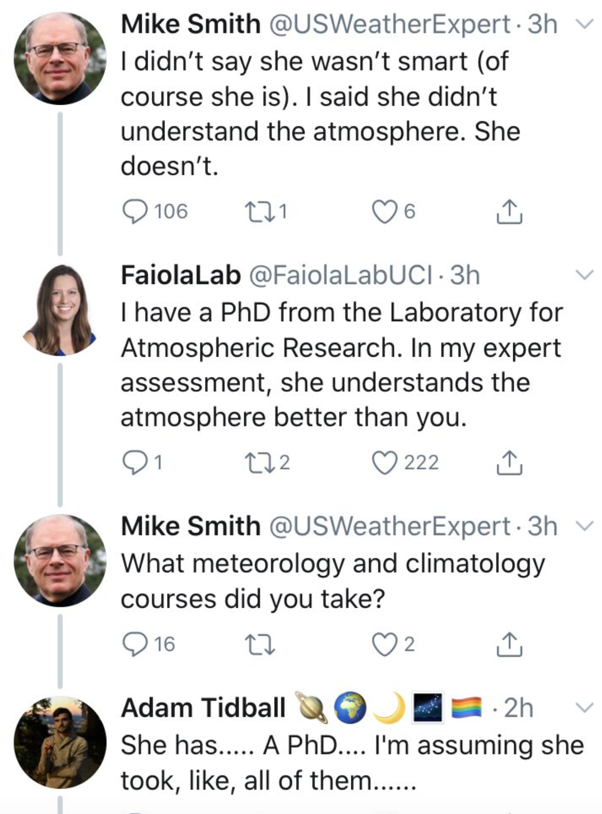But Mike Smith, a retired Kansas TV weatherman who writes a glowing bio for himself and shares links to his own blog as scientific proof of and shills his self published books, apparently spends his free time trolling Twitter looking for women with advanced degrees to condescend to.