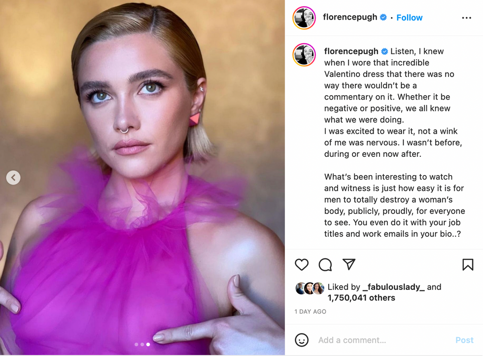 \u201cFlorence Pugh slams body shaming comments over her Valentino dress she wore at the Valentino haute couture fashion show. I love her so much for that. Tell them queen!\u201d— best of Florence Pugh (@best of Florence Pugh) 1657527369