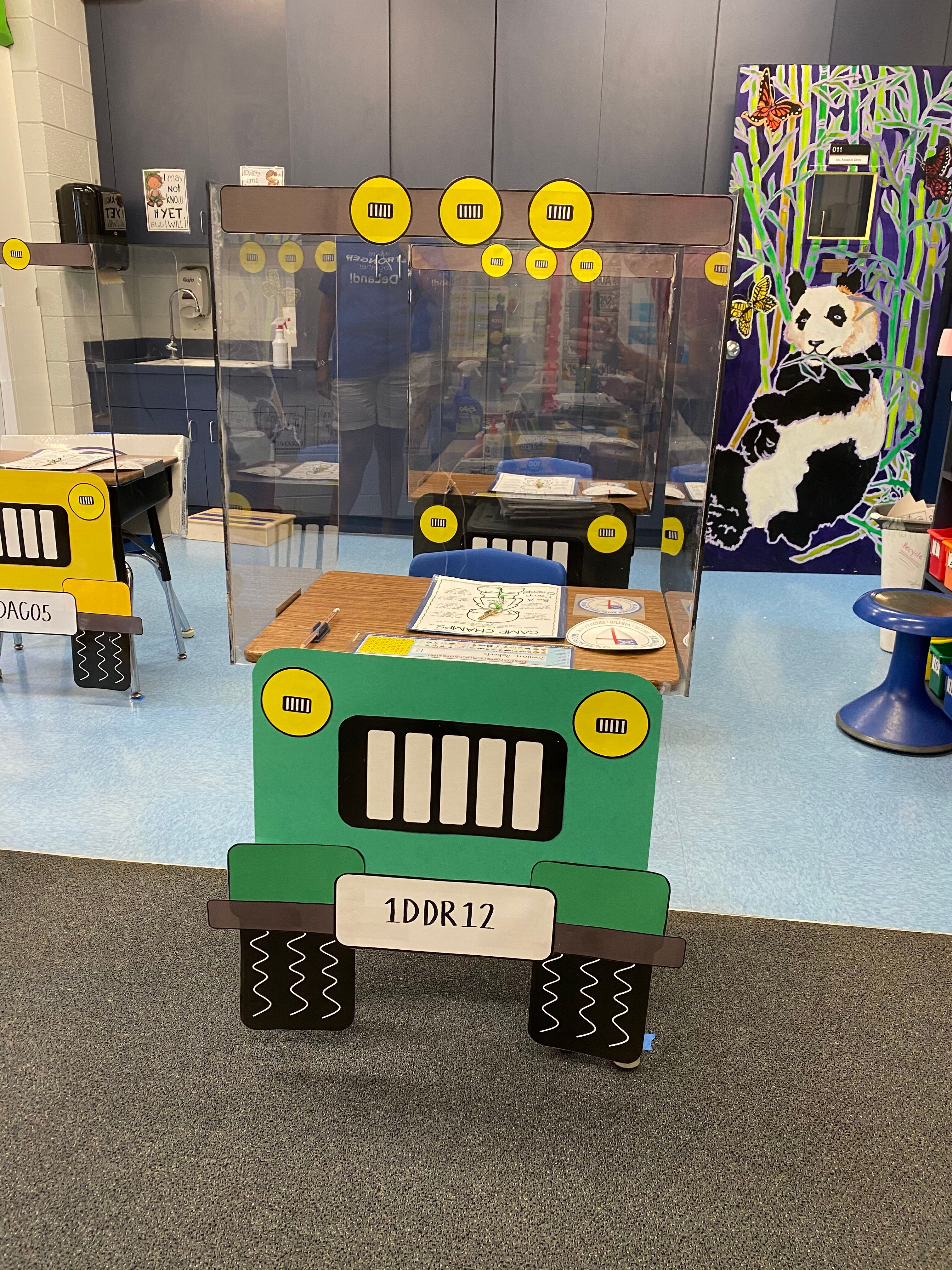 Patricia Dovi and Kim Martin, from St. Barnabas Episcopal School, spent a week redesigning the desks in their classrooms, turning the three-sided plastic dividers into jeeps with paper tires, headlights and license plates for each student.