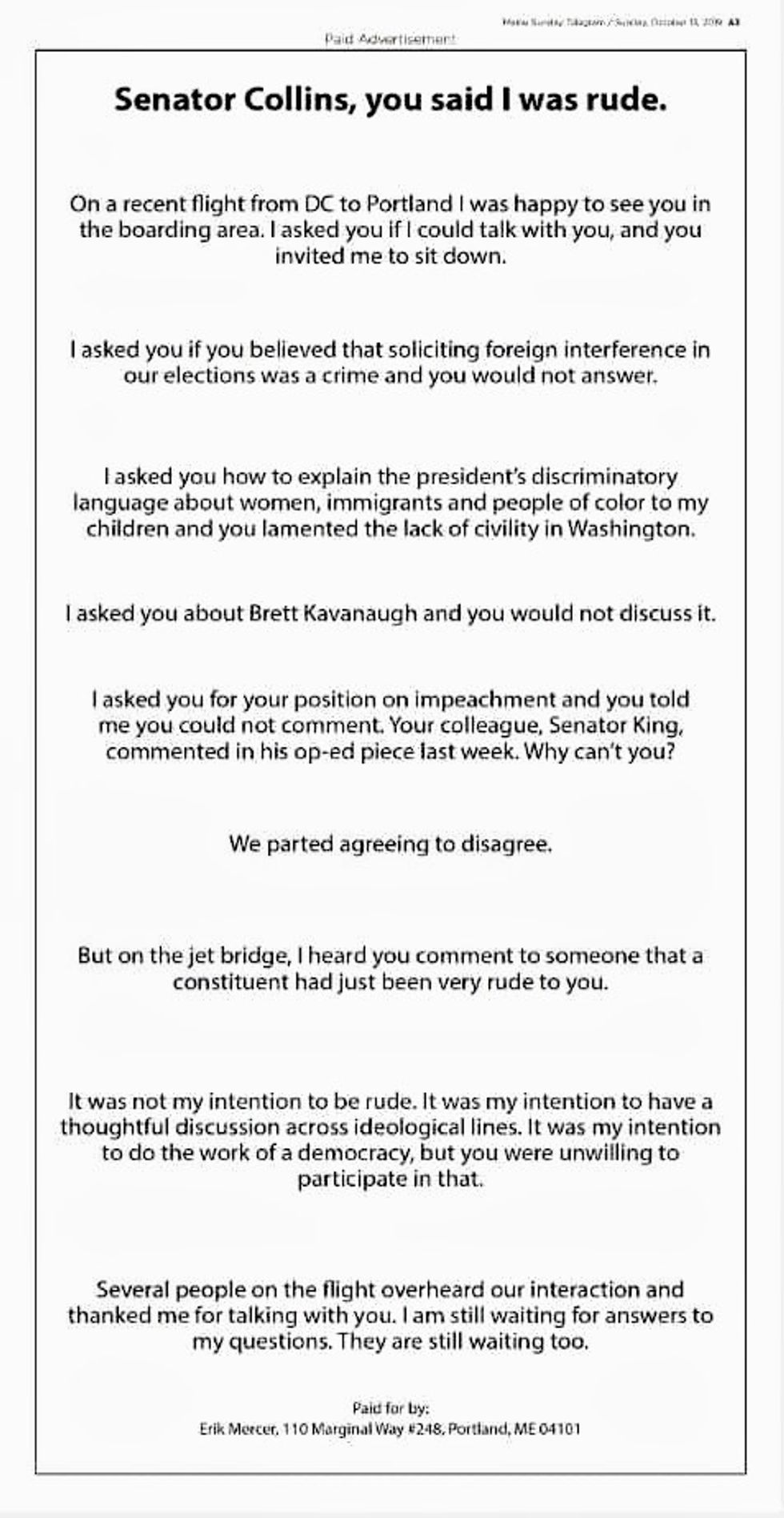 Now, one of her constituents—Erik Mercer—has taken out a full page ad in the Maine Sunday Telegram regarding his interaction with her while waiting to board a plane.