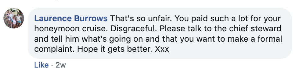 "We only have a few days left but it has really ruined our honeymoon and we do not feel safe on board or comfortable enough to be the honeymoon couple we should be able to be."