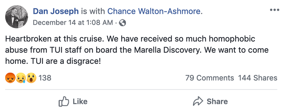 "Heartbroken at this cruise. We have received so much homophobic abuse from TUI staff on board the Marella Discovery."