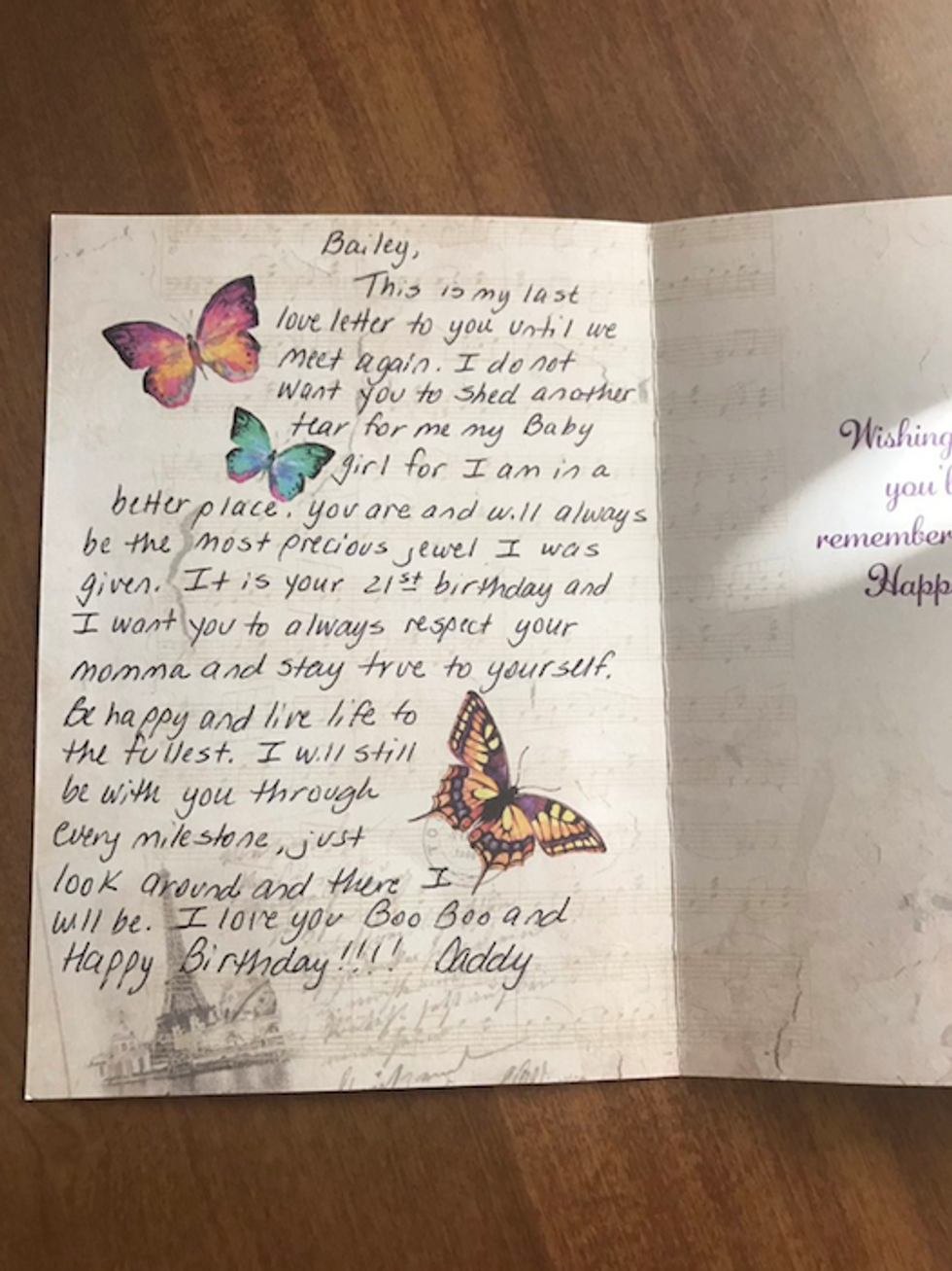 "Baily, this is my last love letter to you until we meet again," read the birthday card. "I do not want you to shed another tear for me my Baby girl for I am in a better place."