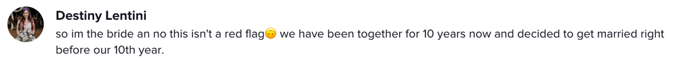 The bride, however, chimed in and defended her man, claiming it "isn't a red flag," as the two have been together for 10 years.
