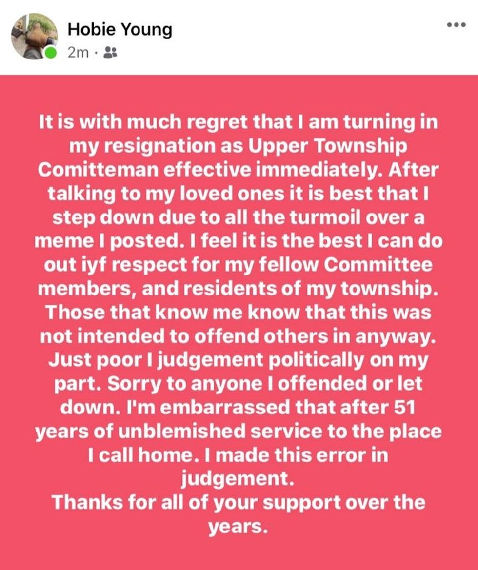 Former Upper Township Committee member Hobard "Hobie" Young faced backlash on social media after sharing vulgar, doctored memes of Senator Harris in sexual positions.