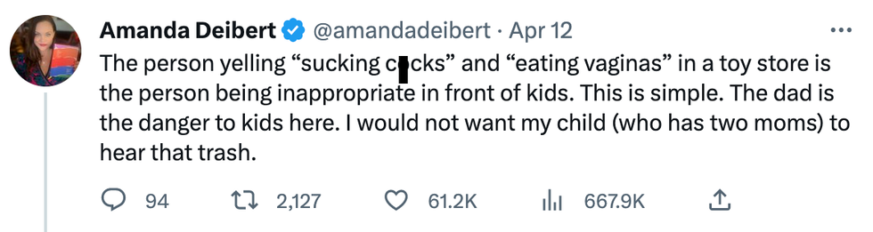 \u201c@charliekirk11 So let me get this straight, a dude walks into a Lego store, starts shouting at workers because they're wearing pride pins, and then starts yelling about sex acts in detail inside a store *for children*, and you're annoyed he was kicked out?\n\nCharlie Kirk are you a pedophile?\u201d— Charlie Kirk (@Charlie Kirk) 1681327460