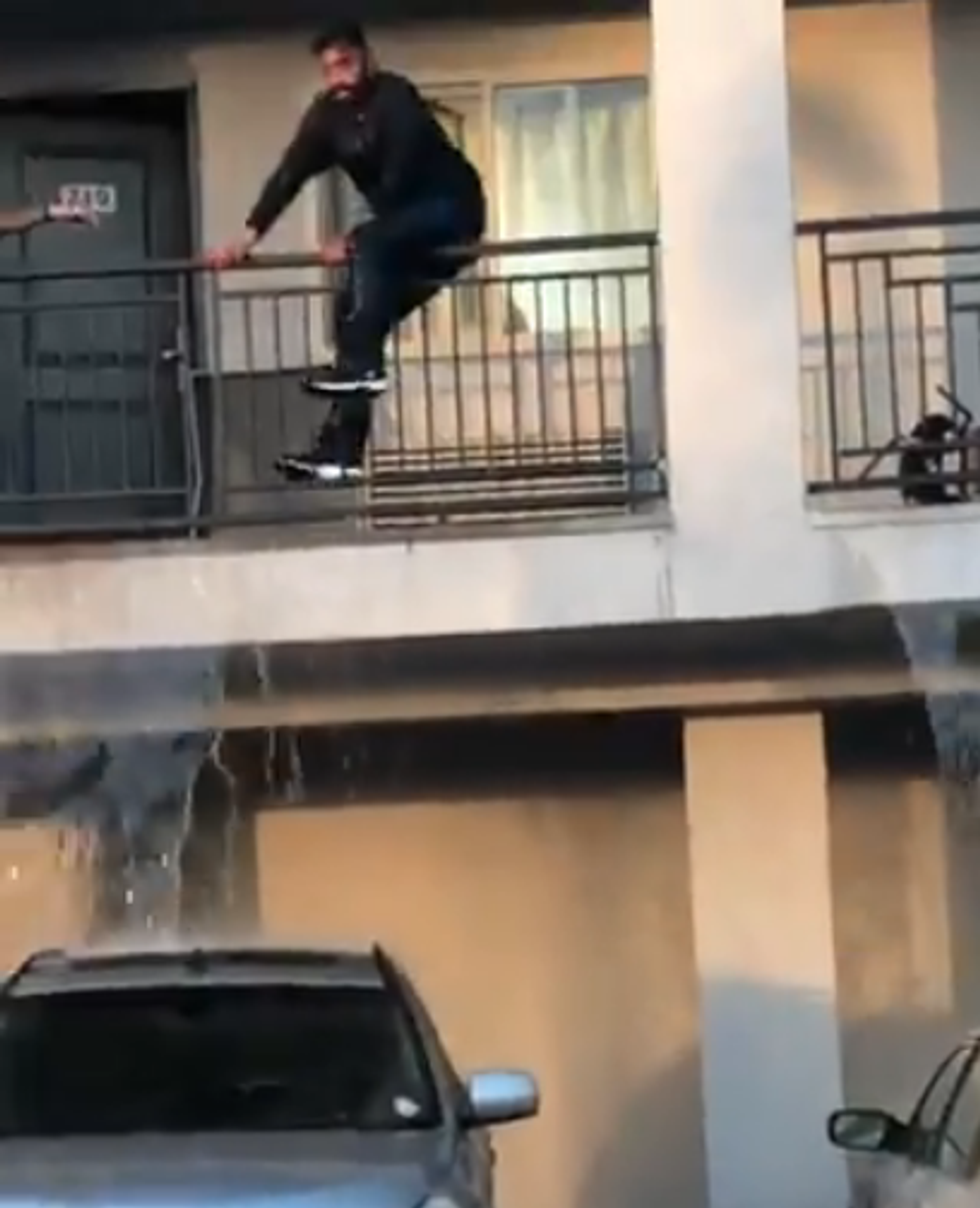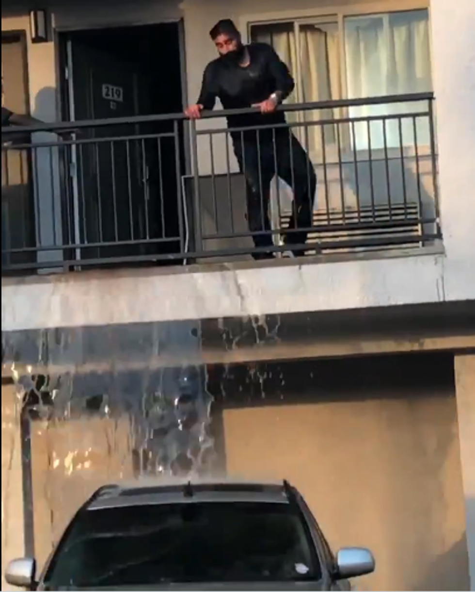 If you'd just somehow flooded an entire hotel and then jumped from a second-story balcony onto another person's car which you've now ruined and lived to be able to saunter away from it all while everyone else was panicking, would you stick around? Or would you get the ever-loving you-know-what out of there?