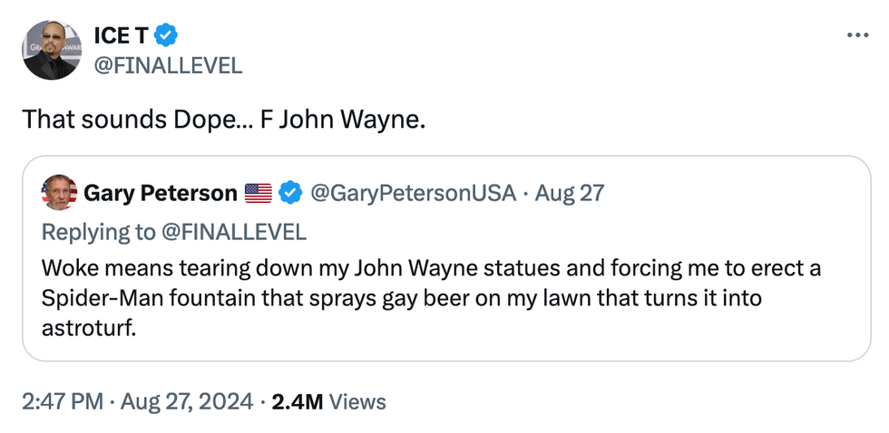 "Woke means tearing down my John Wayne statues and forcing me to erect a Spider-Man fountain that sprays gay beer on my lawn that turns it into astroturf," read the response.